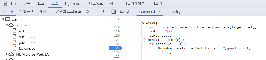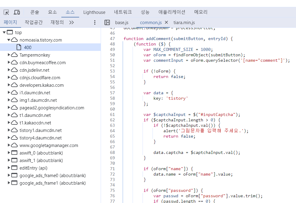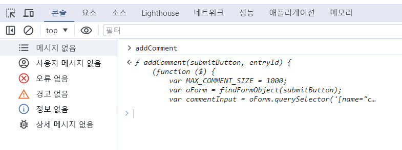 참고로 해당 함수는 global 로 선언이 되어있어서, Chrome 브라우저 기준으로 Console 창에 addComment 라고 친 다음 나온 addComment 함수를 클릭하면 바로 해당 함수의 소스를 볼 수 있는 화면으로 갈 수 있다.