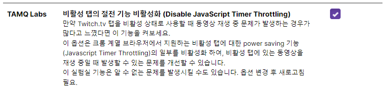 그래서 2022년 3월, TAMQ v0.2.1 에서 Javascript Timer 에 대한 Throttling 기능을 비활성화 하는 실험실 기능을 추가했다. 제대로 동작하는 지는 모르겠으나, 혹시 twitch.tv 를 비활성 탭 상태로 사용하면서 문제를 많이 겪었다면 "비활성 탭의 절전 기능 비활성화" 기능을 켜서 문제 개선을 시도해보는 것이 좋겠다.