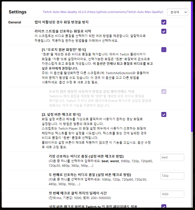 자동 화질 변경 시 재생이 중지되는 오류가 간혹 발생하기도 하고, 24시간마다 매번 원본 화질을 다시 설정해야 하는 것은 사소하지만 귀찮은 일이다. 그래서 화질 자동 변경을 막고, 매번 재생 시마다 화질을 원본 화질로 설정해주는 툴을 브라우저 확장 기능의 일종인 UserScript 기반으로 만들었다. 이름은 Twitch-Auto-Max-Quality 이다. 일단 생각나는대로 코드를 짜깁기해서 동작만 되게 만들어둔 것이지만 작동은 잘 된다. Github 링크 (https://github.com/nomomo/Twitch-Auto-Max-Quality)