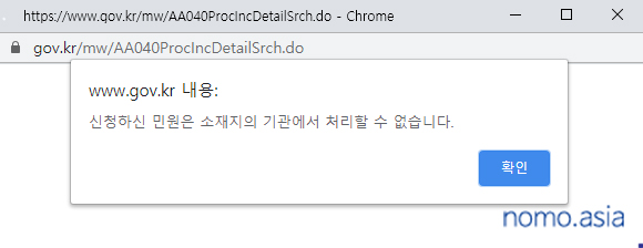 그런데 내 경우, 우리집 주소나 집 근처 주소를 입력하면 아래와 같은 팝업창에 "신청하신 민원은 소재지의 기관에서 처리할 수 없습니다." 라는 메시지가 나타나며 그 다음의 절차를 진행할 수 없었다.