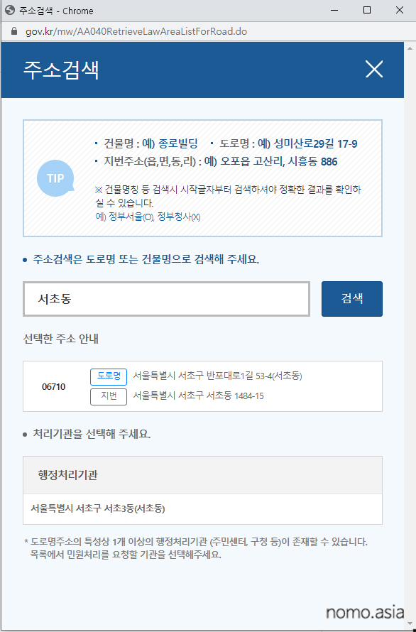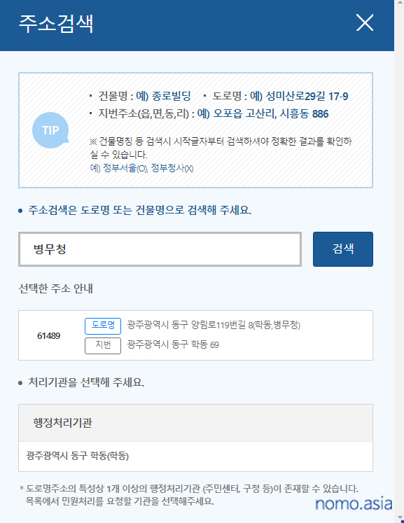 테스트삼아 내 주변 이곳 저곳의 주소를 전부 넣어봐도 다 안 되길래, 테스트삼아 병무청을 입력해봤더니 광주광역시 동구의 주소가 하나 나타났고, 이 주소를 선택하니 위와 같은 메시지 없이 정상적으로 진행되었다.