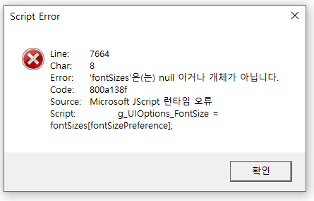 이 외에 여러 Script Error 창이 연이어서 나타날 수 있다.