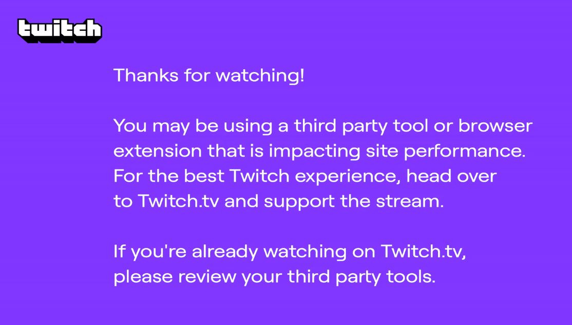 원인: Adblock 과 같은 광고 차단 확장기능이나 특정 Twitch 전용 광고 차단 툴을 사용 중인 경우 보라색 화면 문제가 발생할 수 있음(Adblock plus 는 문제가 없다고 함). 특히 Adblock 의 경우 Adblock 자체 문제로 whitelist 에 twitch.tv 를 추가하여도 문제가 발생하므로 Adblock 확장기능을 완전히 비활성화 또는 삭제해야 보라색 화면이 나타나지 않게 됨.