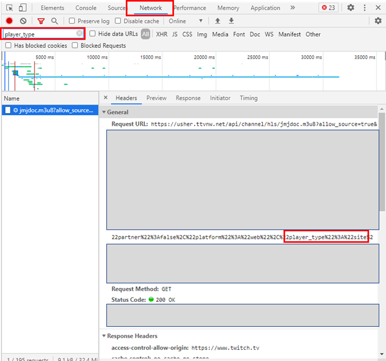 - Headers 탭의 Request URL 항목에서 player_type 뒤에 나오는 글자가 site 인지 확인한다.
