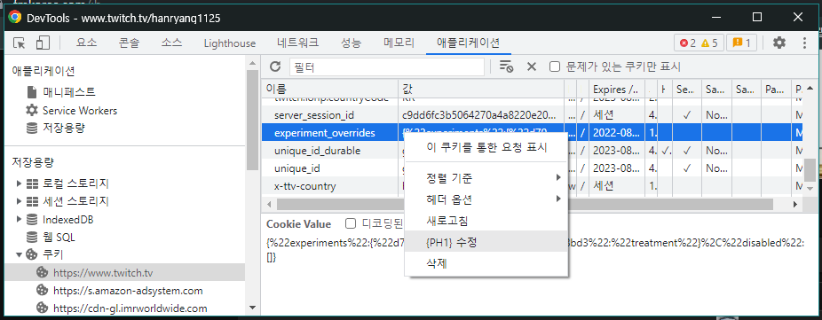 - 쿠키 - twitch.tv 를 선택한다.