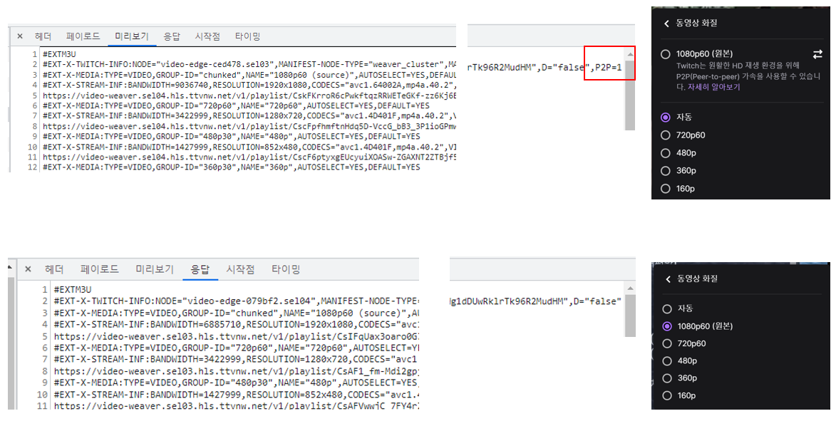 - 응답 탭으로 간 후, 가로로 쭉 스크롤하여 "P2P=1" 이 있는지 확인한다.
