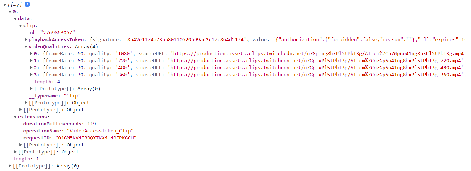 정상인 경우 VideoAccessToken_Clip 에 대한 응답은 다음과 같아야한다.