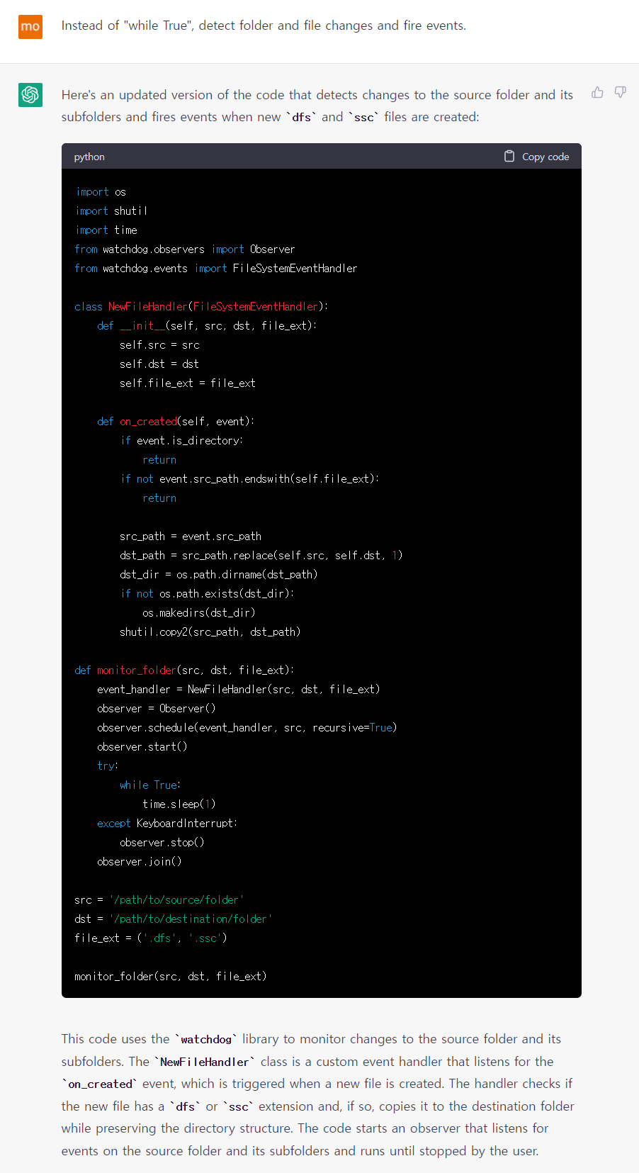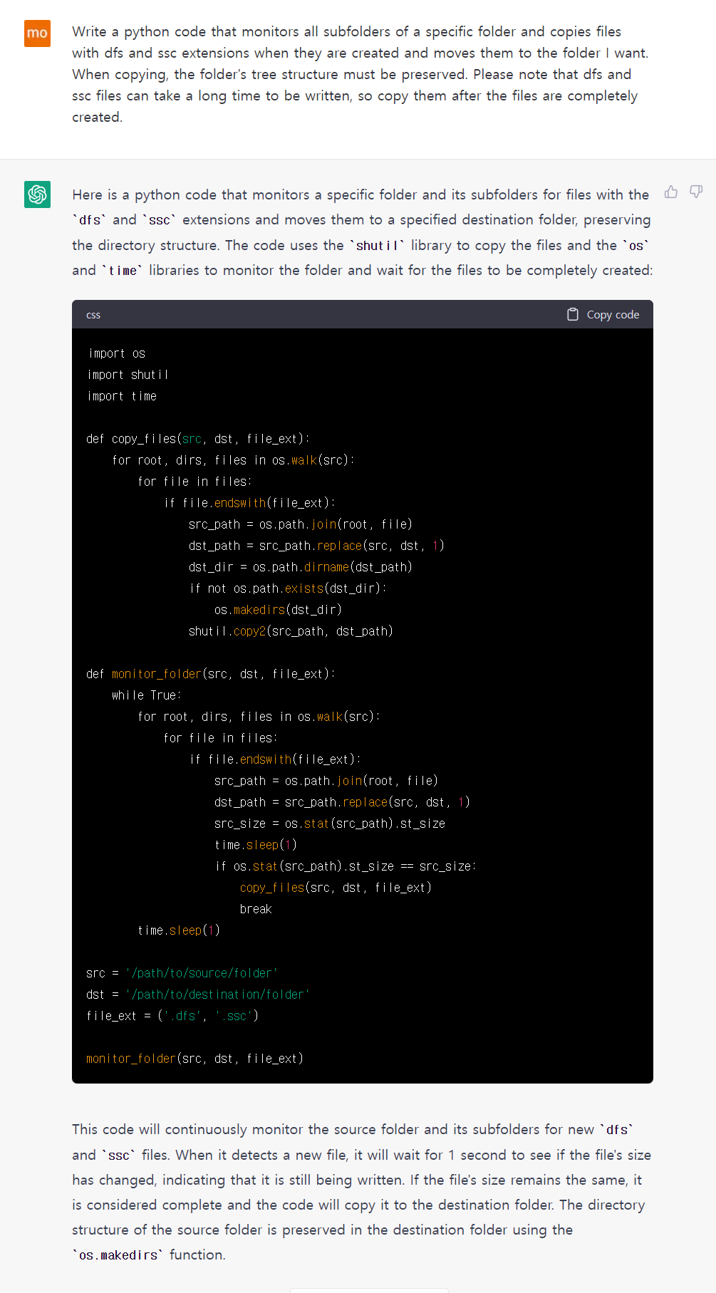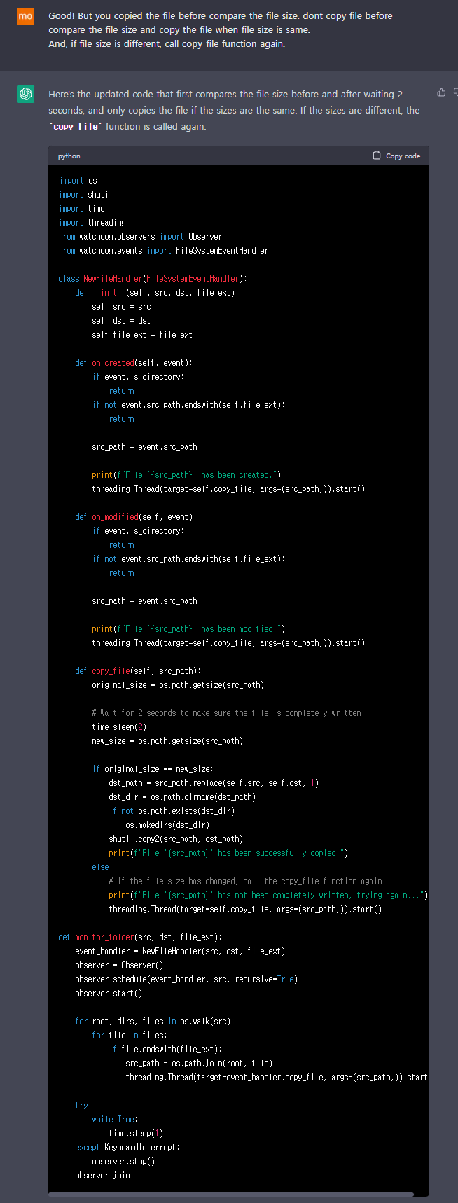음... 그랬더니 ChatGPT는 While True 로 무한 루프를 돌면서 폴더 구조를 무식하게 모니터링 & 무한 복사하는 코드를 작성했다. 그래도 파일 생성이 완전히 된 후 복사해야 한다고 명령을 내렸더니, 현재 파일 사이즈가 1초 전과 동일한 경우에 복사하도록 작성된 부분은 센스가 있었다 ㅎㅎ