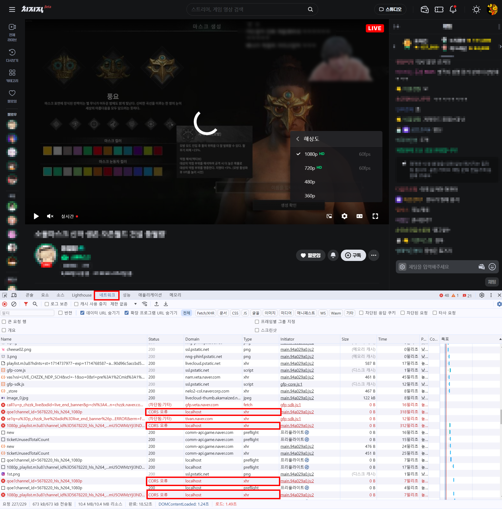 최근 치지직의 그리드 업데이트 이후 720p 또는 1080p 재생 시 무한 로딩, 무한 버퍼링이 발생하는 문제가 나타났다. 모두에게 발생하는 문제는 아니고 "일부" 사용자에게서만 발생하는 문제인 듯하다. 본인은 최신 Chrome 브라우저를 사용 중이다.